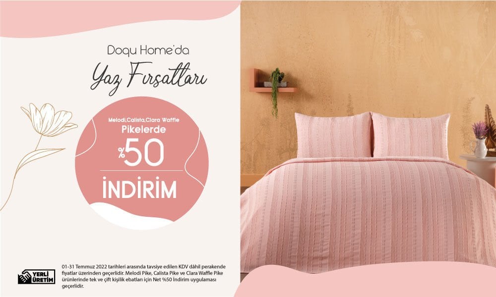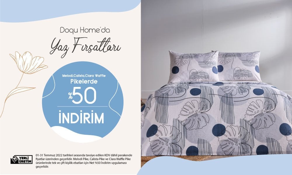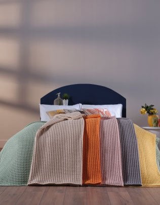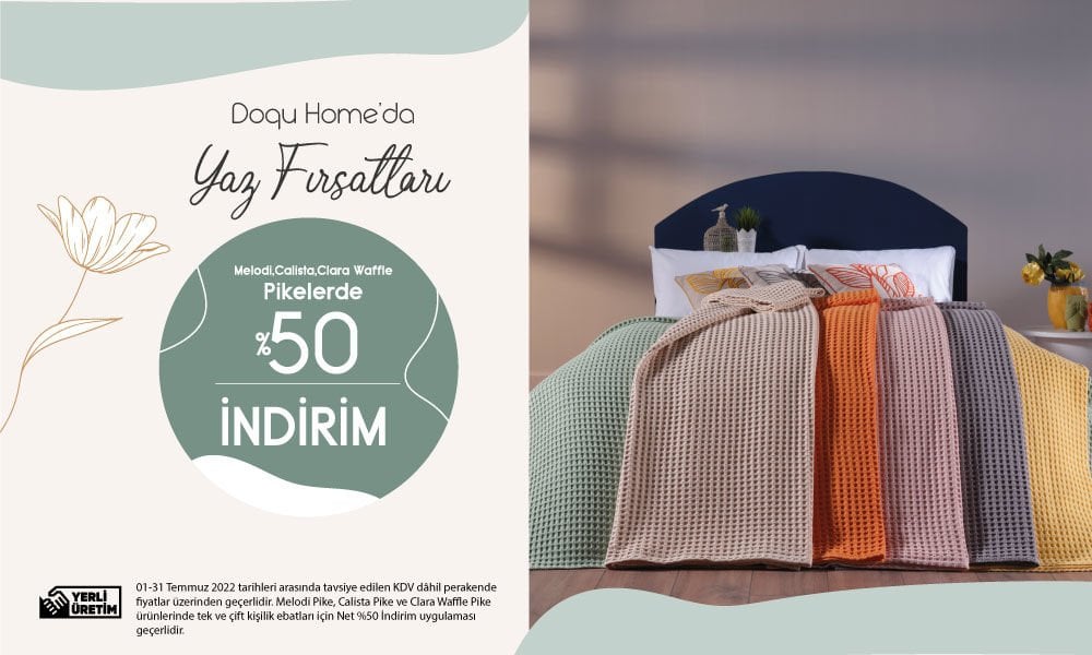 Doqu Home yatak örtüsü modellerimizin tamamı nevresim takımlarımızın tamamlayıcısı niteliğinde olduğu kadar zengin renk seçeneği ile oda takımlarınıza da ahenk kazandırmak için hazırlandı. Sade, şık veya modern tarzlarını beğeninize sunuyoruz. Modern tasarımları ile yatak odanızda görsel şölen havası verirken pamuklu kumaşı yumuşak tuşesi ile sıcak yaz aylarında güvenle üzerinize örtü olarak kullanacağınız tarzda üretildi.